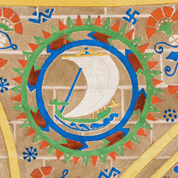 Elemental Air was the combination of the qualities of "wet" and "hot", and possessed "lightness," which moved it upwards. It was situated between Water and Fire in the cosmos. Air is depicted here as a woman wearing flowing garments surrounded by birds in flight. The three icons surrounding the figure represent discoveries or inventions that harness the power of air including a bellows, sailboat, and windmill. Air could range from rare and tenuous to dense fog, suggesting to the Presocratic Greeks that it could account for all matter. It also symbolized the human soul and the breath of life. In early Greek medicine, blood was thought to be refreshed and invigorated by inhaled air in a series of "cookings" that took place within the heart. They and we see the global movements of air tied to the warming of the sun, something Aristotle called the "lesser circulation" to distinguish it from the revolutions of the celestial spheres. In addition to sustaining life, it was also harnessed to do work, as the several icons suggest.