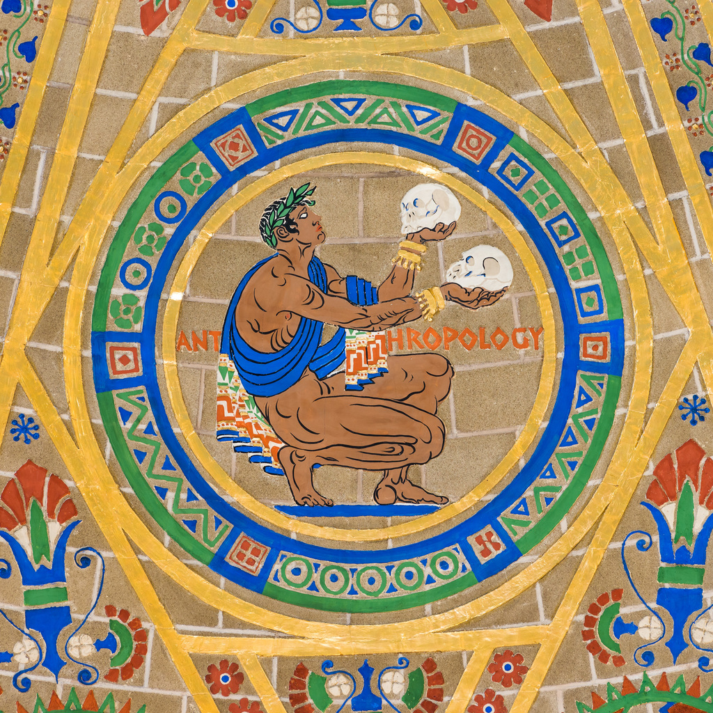 Anthropology explores the origins of humankind, as well as the tremendous diversity of cultural and social relations among human groups. Anthropology tackles challenging questions of human identity and experience using many allied sciences. The Neanderthals, an extinct species closely related to modern humans, have captivated us since the discovery of their remains in Europe in the nineteenth century. They were skilled toolmakers, displayed complex social organization, and may have buried their dead. Neanderthals and modern humans co-existed in Europe for thousands of years, and recent genomics research suggests that there may have been limited interbreeding. Paleoanthropologists take particular interest in studying the physical traits, migration patterns, tool development, and cultural markers of early humans and their relatives. The main image depicts Anthropology studying and balancing two skulls, one modern and the other decidedly older and very different. When the Academy dome was designed, a century of excavation and controversy surrounded the analysis of skeletal remains and especially skulls. Darwin's theory had provided the scenario of a gradual evolution of humans from animals, particularly apes. While modern bones and skulls were suggestive, excavated and older bones and skulls provided both confirmation and also many puzzles. In two, smaller images ancient, primitive man and modern, Greco-Roman man gaze at one another across time.