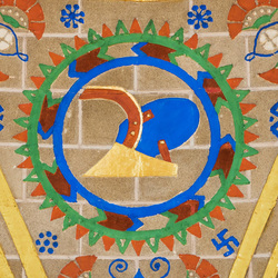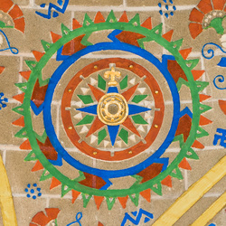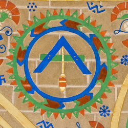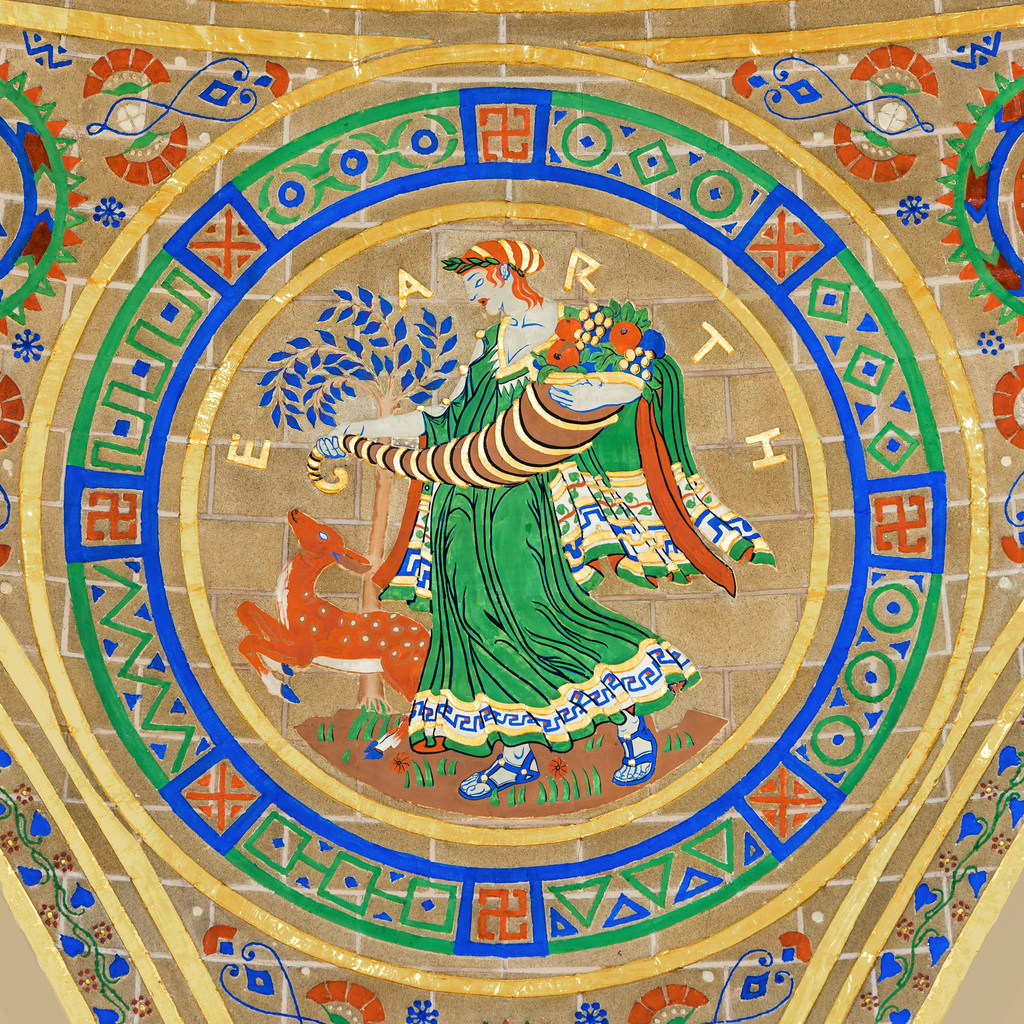 Elemental Earth was the combination of the qualities of "dry" and "cold," and possessed "heaviness," which moved it downwards. It was situated around the center of the spherical cosmos. Earth is depicted here as a woman holding a bountiful cornucopia, surrounded by flora and fauna. The three icons around the figure represent discoveries or inventions that harness elemental earth. Depicted are a plowshare, a level with pendulum bob, and a compass. Emerging in the pre-history of our species was a deep-seated sense of the earth as our "nurturing home." Hunter-gatherers combed the ground for sustenance and simple tools. With settled agriculture, farmers bonded with the soil. The earliest mathematics and astronomy aimed to manage the annual cycles of planting and harvest, and the important season of autumn as a time of bounty is readily apparent in this depiction. Other metaphysical attributes associated with the element include stability, heaviness, fertility and nurturing. In ancient Greek medicine, black bile, or the melancholic humor, was equated with elemental earth. This element is so fundamental that many societies identified our globe as, literally, the earth.