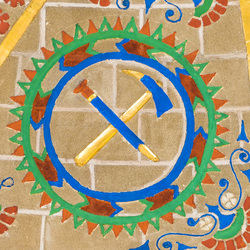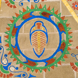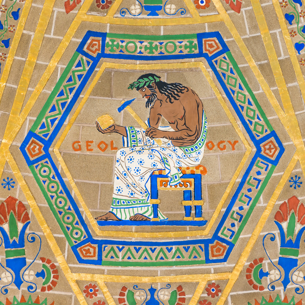 Field geology has traditionally plied its science with little more than a hammer, chisel, and often a hand-lens. The geologist depicted in the main image is scrutinizing the rock with the same intensity geologists have always used, and he is about to strike it to determine its hardness and examine its inner structure. Using collected rocks, themselves diagnostic of the formations from which they were chiseled and gathered, precise location information, and a variety of theories, geologists identify the basic structures of the surface and interior of the earth and the forces and mechanisms responsible for their formation and evolution. Two smaller images complement this icon. One repeats the hammer depicted in the main image. The other shows a fossilized trilobite, an ancient crustacean that lived in the early oceans of the earth but is now extinct. The locations of these and many more fossils were used to date meticulously the various formations and their extent, and to compile the basic chronology of the earth. As with astronomy, these simple tools and procedures were still used at the time the Academy's dome was designed, but were in transition. Geology, too, was adopting the instruments and methods of physics to great advantage, and allied disciplines known as geophysics and geochemistry were developing. Still, even today, the hammer and chisel are ubiquitous tools, and examinations of fossils within strata a continuing research activity.
