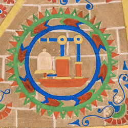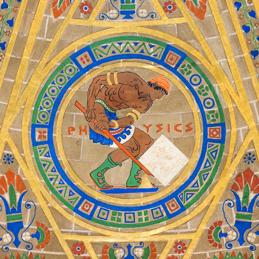 Physics, from the Greek word for "nature," is the oldest and most basic of all the sciences. Since its ancient origins, physics has provided us with an evolving yet comprehensive picture of the world around us and has served as the prototypical science. The main image recalls the famous words of Archimedes, "Give me a place to stand and a lever long enough and I shall move the world." While his predecessor, Aristotle, was the definitive author and promulgator of physics as theory, Archimedes was the most famous "applied physicist" of his day and long thereafter. The Academy dome was designed at a time of intense popular enthusiasm for the discoveries in basic physics and astronomy, from mysterious quantum physics and relativity to the expanding universe. But it was also a time when the public and the professions were intensely interested in the applications of science to industry and to the general welfare. As in ancient Greece, pure and applied sciences were bound together in an uneasy relationship. Two smaller images expand this theme. The Air Pump of Robert Boyle was an iconic instrument used to investigate many principles of the new physics. The electromagnet depicted in the other smaller image was used by Michael Faraday to demonstrate the conversion of electricity and magnetism and led the way to the concepts of energy and field. It, too, was iconic and emblematic in its day and stimulated many useful inventions.