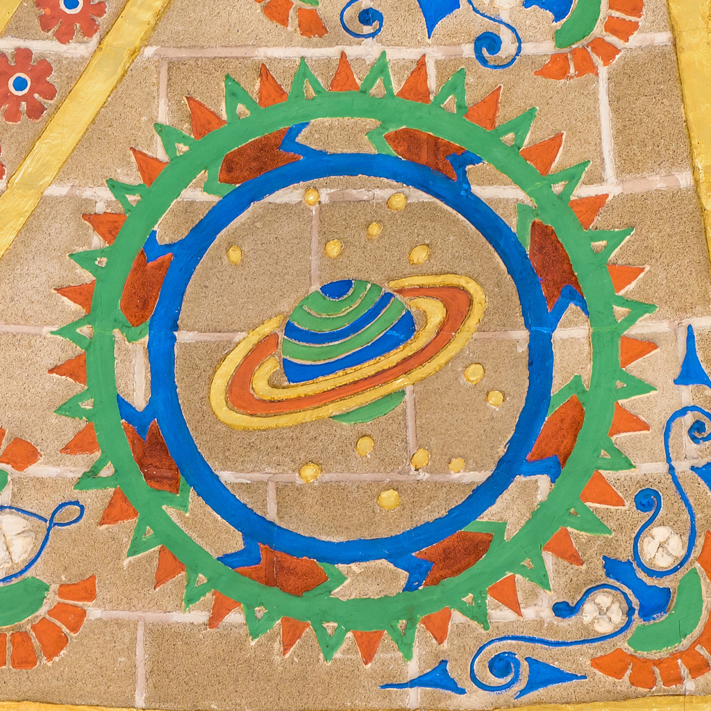 Two smaller images expand and elaborate the motif of Astronomy as an aesthetic and a practical activity. An image of Saturn, perhaps the most beautiful and accessible telescopic sight in the sky, evokes the wonders to be seen and understood through astronomy. At the time the Academy dome was designed, this unique ringed planet was the most popular image representing visual astronomy to the public.